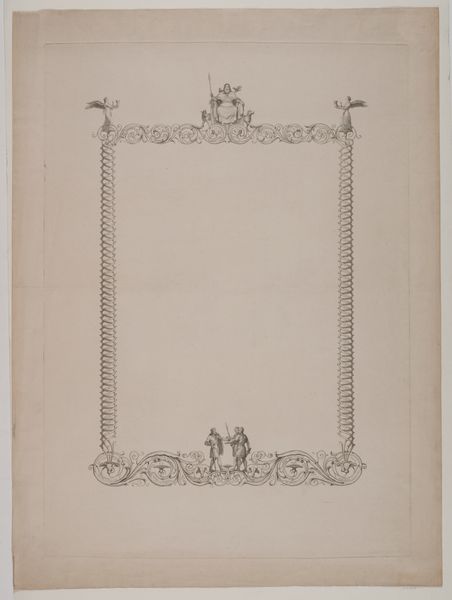 Editor: Here we have Reinier Vinkeles’ “Omlijsting met een adelaar en twee putti met snaarinstrumenten,” an engraving created sometime between 1751 and 1816. It’s so delicate, with the fine lines of the engraving giving it an ethereal feel. What's your take on this piece? Curator: What I see is a reflection of power and privilege carefully packaged within seemingly innocent, decorative elements. Consider the eagle, a recurring symbol of empire and authority, perched atop what appears to be a frame ready to display…what? Whose image? Whose story? Editor: That's a really interesting point. I was focused on the cherubs with their instruments, thinking about music and beauty, but the eagle definitely changes the context. Curator: Exactly! The cherubs and musical instruments lull us into a sense of idyllic harmony, perhaps even divine blessing, but the eagle reminds us of the often-violent realities that underpin such seemingly innocent scenes. This tension—between beauty and power, innocence and dominance—is central to understanding the art of this period. Whose stories were silenced to create these visions of harmony? And how can we, today, amplify those voices? Editor: So, you're suggesting we look beyond the surface-level beauty and consider the power dynamics at play? Curator: Precisely. And think about what’s *not* shown within that central space. Who is excluded from this framed narrative? This engraving, therefore, is not just a pretty decorative piece, but an invitation to critically examine the narratives and ideologies it upholds, however subtly. It asks us to be active viewers. Editor: Wow, I’ll never look at cherubs the same way again! I always thought of engravings as just pretty, but it's amazing how much history and politics can be embedded in the imagery. Curator: Exactly! And by recognizing these historical biases, we become better equipped to challenge similar inequalities that persist in our contemporary world. Art then becomes a mirror reflecting our own complicities and responsibilities.
