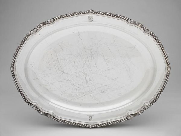 Curator: The cool sheen of this silver dish gives me a sense of austere elegance. Editor: Indeed. This is a "Meat Dish" crafted by William Stroud. While undated, its form and the maker's mark suggest it likely dates to the late 18th century. The piece is currently held in the Harvard Art Museums. Curator: The shape is so classical, almost Roman. I wonder what symbols were served, so to speak, on it. Editor: The fact that it’s silver immediately signals status and wealth. The use of silver for dining elevated the ritual of eating into a display of cultural power. Curator: So, it is not merely a functional object but a statement about hierarchy and societal roles. Editor: Precisely. Even the relatively simple ornamentation speaks volumes. A dinner party was not just about sustenance, but about reinforcing social bonds and displaying affluence. Curator: It’s fascinating how such a seemingly simple object can reveal so much about the culture that produced it. Editor: Yes, examining the aesthetics and the history allows us a glimpse into the lives and values of those who once gathered around this dish.