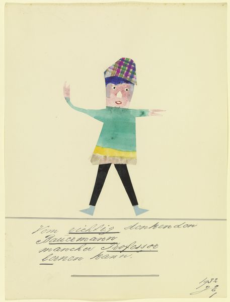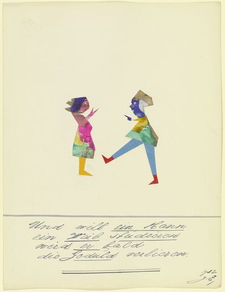 Curator: Look at this intriguing piece by John Elsas, from 1932, housed right here at the Städel Museum. It's called "17541 (Es ist ein altes Lied…)", a combination of drawing, collage, and gouache. Quite a mix, right? Editor: Yes, a strange concoction! My first impression? Simultaneously melancholic and whimsical. That solitary figure on the pink platform seems to be both performing and protesting. The patchwork body suggests a fragmented identity. Curator: Precisely! Elsas blends abstraction with figuration, characteristic of Expressionism, and employs unconventional materials like paper and ink to construct this expressive character. Editor: It feels very much like an interwar statement. The textual fragment at the bottom--something about an old song and the difference between doing and saying—underlines the performative anxiety. Is the character speaking truth to power or merely acting a part? Curator: Perhaps it’s both? The materials themselves, the collage, speak to a piecing together of self, or nation, from disparate fragments in a fractured time. Editor: Indeed, and considering Elsas’ biography, as a Jewish artist working in Germany during the rise of Nazism, one wonders about the layers of coded messaging at play. The lone figure feels vulnerable but also defiant. The vibrant colors almost scream for attention amidst the impending darkness. Curator: There's an intentional rawness that really captivates, don't you think? It's not polished or refined; it's immediate, visceral. Editor: And intensely political, even in its apparent simplicity. Elsas prompts us to consider who is given a stage, whose voices are amplified, and the immense responsibility that comes with it. The stakes are high, which you can tell in its stark composition and vulnerable form. Curator: For me, this piece reminds us of the artist’s role, not as a passive observer but as an active participant. There’s power in its quiet assertion. Editor: Definitely. “Es ist ein altes Lied…” It might be an old song, but it continues to resonate powerfully today, challenging us to interrogate the structures of power and representation that shape our world. Thank you for walking me through this insightful work. Curator: The pleasure was all mine. Always something to find in these poignant images of expression.