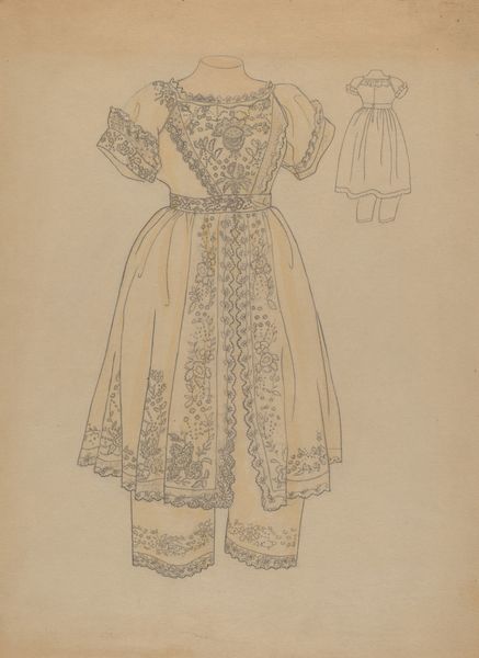 Sarah F. Williams made this costume design in watercolor, and you can really see her process in the layering of washes that give the silk taffeta its sheen. The rendering of the fabric has this incredible translucence, but then there's this opaque, matte patterning laid on top: Vines and leaves and dark clusters of grapes that look like they’ve been stamped on. Look how the sleeves billow and bunch and gather, it’s so luscious! There's a real tension between the flat, decorative elements and the illusion of depth and volume that she's creating with the modeling of light and shadow. It reminds me a bit of Matisse’s paper cut-outs, where he was trying to reconcile drawing and color and form all at once, collapsing the space between them. Williams is also doing this, only with fabric. It makes me wonder, did she sew? Maybe it’s an insight into her own design process, or maybe it's just a beautiful drawing that invites us to imagine other ways of seeing.