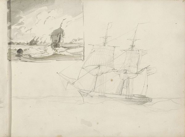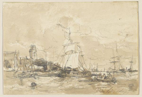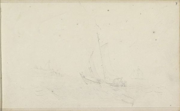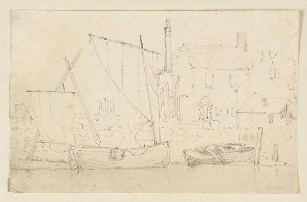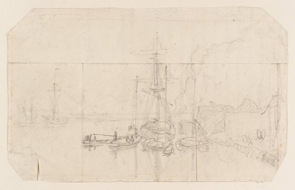 Curator: Here we have an undated pencil sketch by William Henry Hunt, who lived from 1790 to 1864, currently residing in the Tate Collections. It’s a small work, only 73 by 94 millimeters. Editor: There's a quiet simplicity to this sketch, isn’t there? The sparseness of the lines really evokes a sense of stillness on the water. Curator: Absolutely. Given Hunt's context, and the rise of British maritime power, these boats become symbols of trade and empire, but also perhaps emblems of aspiration for many. Editor: I agree, although the pencil medium itself seems to be downplaying any sense of grandeur. The rough paper stock further emphasizes the unpretentious quality and invites us to reflect on labor and materiality in coastal communities. Curator: A good point, and it highlights how the very accessibility of works like these allowed for a wider engagement with the visual culture of the time. Editor: Looking at this, it feels more immediate, a glimpse into another era. Curator: Indeed, it’s a piece that speaks volumes, even in its quietness.