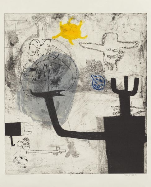 Editor: Here we have Noriko Saito's "Life 1," a captivating print held here at the Harvard Art Museums. I'm immediately drawn to its raw energy. What do you see in this piece? Curator: It feels like a visual poem doesn't it? The spidery lines, the lone splash of yellow, like a sun struggling to break through the clouds. I wonder, are we witnessing birth, or perhaps a quiet unraveling? Editor: That yellow is so unexpected. I was thinking about how it might interrupt an otherwise grayscale composition. Curator: Perhaps that’s the point. It’s a defiant little bloom amidst the scratches and shadows. It pulls you in, doesn’t it? Invites you to find your own story within the chaos. Editor: I love that perspective. It definitely reframes my initial reading. Curator: Art is that, right? A collaborative dance between the artist and the viewer, each finding their own rhythm in the lines.