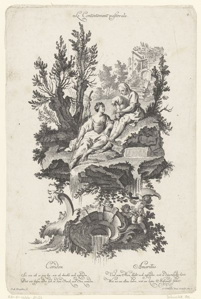 Curator: Good day! I’m delighted to present to you "Personificatie van het flegmatisch temperament," an engraving dating back to 1745, created by Johann Gottfried Thelott. It's currently held at the Rijksmuseum. Editor: Oh, my first impression is… peaceful. Even with all the baroque flourishes, that seated figure seems so utterly still and self-contained. Almost a little melancholic, wouldn't you say? Curator: Melancholic perhaps, though consider that the work is an allegory, part of a series representing the four temperaments. The “phlegmatic temperament,” was, in the old, medical thinking, associated with calmness and composure. Editor: Composure! Yes, that's definitely present in his posture. The way he holds that staff—not tightly, but with a relaxed grip. Can you tell me more about how Thelott uses the engraving technique to represent this temperament? Curator: Certainly. Thelott uses fine, detailed lines to create texture and shadow, giving a sense of depth despite the monochromatic nature of the print. Note the intricate, almost ornamental frame surrounding the central figure, filled with acanthus leaves. The formal, ornate border gives a strong contrast with the sitter's relaxed pose. The balance between the frame and figure enhances its aesthetic appeal. Editor: It's striking how that frame, with its robust, lively swirls, seems almost to contain the languid nature within. Like a vibrant energy attempting to spark some sort of action, or emotion, perhaps. It hints at potential, that spark of vitality resting, not absent, you know? The old tree in the landscape also echoes this; there’s an echo between it and the seated person—a connection to nature, to roots. It gives me the impression that patience itself is being personified! Curator: A lovely observation! His placement against a serene landscape further reinforces that connection and idea. The image seems to suggest an inner world as rich and detailed as the outward show of the ornate frame. Editor: Indeed. It makes you wonder what thoughts meander through that calmly observing mind. So much detail encourages one to imagine, to dream, doesn't it? Curator: Precisely, and the beauty of Thelott's engraving lies, perhaps, in this invitation for contemplation and a pause, encouraging an unhurried way of seeing the world. Editor: And understanding ourselves! I will take with me his reminder that quietude and a measured approach are, after all, virtues too. Thank you!