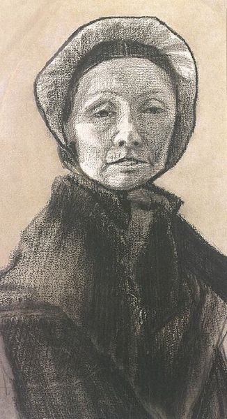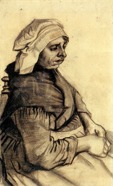 This study of a woman with a hat was created by Vincent van Gogh using black crayon or chalk, and paper. Van Gogh's choice of medium influences the artwork's appearance. Chalk is immediate and raw. It allowed him to rapidly capture the woman's features, and the texture of her clothing. Looking closely, you can see the density of the marks: dense hatching creating the dark tones of her hat and cloak, and lighter, smudged areas defining her face. The physical act of drawing becomes apparent. Considered by some to be the medium of skilled artisans and casual street artists, rather than academic painters, this artwork demonstrates Van Gogh's interest in the lives of everyday people. The marks on the paper reflect the labor and time invested in its creation, but also echo the hard work and toil in the sitter's own life. Ultimately, the choice of materials and making process contributes significantly to the emotional depth and social commentary that Van Gogh was aiming for, blurring the boundaries between fine art and craft.