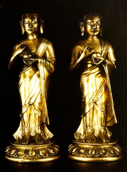 Editor: Here we have a "Standing Buddha" made in approximately the 8th century, currently housed at the Minneapolis Institute of Art. It is crafted out of bronze. The statue has an overall feeling of serenity, despite showing its age through darkened spots across its form. What can you tell me about its history and the purpose it served? Curator: That serene quality, as you observed, likely reflects the intentions of both the artist and the patron. Eighth-century Buddhist sculpture played a vital role in disseminating religious and political power. Bronze sculptures like this would often be commissioned by wealthy patrons and placed in temples. Their presence visually legitimized both the donors and the ruling elite through associations with Buddhist ideals of peace and wisdom. Consider its scale - how do you imagine it being displayed? Editor: Perhaps on an altar within a temple, intended to inspire reverence among worshippers? Did the democratization of artistic interpretation apply to these sorts of pieces? Curator: Indeed, their placement suggests that, influencing public perception. While individual experiences certainly varied, the overall objective of devotional art remained relatively controlled by religious and political entities. This ensures standardized beliefs. It also ensured standardized iconography to promote the intended narrative, but the style also evolved through cultural exchanges across Asia. Think about how that uniform standard can shift, alter, or change beliefs as new societies are established. Editor: It’s fascinating how much power these objects held in shaping social structures. Curator: Exactly. The sculpture, then, is more than just a depiction of the Buddha. It is a historical artifact, laden with cultural and political meaning that continues to resonate today. Editor: I never thought about art holding that sort of power over governments in ancient times. I'll look at these works from that context going forward! Curator: I’m glad I could give you another way of looking at art history!