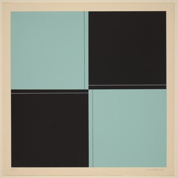 Editor: This is Gordon House's "Series 40cm Continued J". It's a print, held at the Tate. I'm struck by the sharp, angular shapes. What do you see in this piece through a formalist lens? Curator: The interplay of color and form is paramount. Notice how the varying shades of green, juxtaposed with the stark black, create a dynamic tension. The geometric composition invites a semiotic reading of space and depth. Editor: So, it's more about the relationships between the shapes and colors than any kind of story? Curator: Precisely. The intrinsic qualities are what define the work's aesthetic impact. Editor: I see it now; the composition is very assertive. Curator: Indeed, considering this perspective, the image becomes a study of abstract relationships.
