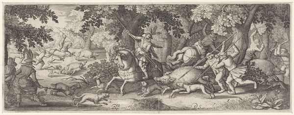 Editor: Here we have "Five Resting Horses in a Landscape," a 1583 engraving by Marcus Gheeraerts the Elder. The horses almost look like they're posing, reclining so elegantly! It feels very staged, almost theatrical. What's your take on this scene? Curator: Staged indeed! There’s a dreamlike quality, isn’t there? Like stumbling upon a Renaissance ballet of horses. Gheeraerts wasn't just showing off his skill; it was more than mere animal husbandry at play here. The detail, like those miniature buildings on the hills, pull you in. Makes me wonder what symbolic resonance these horses might have held. Perhaps emblems of leisure or earthly dominion. Do you think their poses reveal something? Editor: It’s interesting you mention symbolism. They do seem a bit too…comfortable? Like they're completely unburdened. The northern renaissance aesthetic makes everything feel meticulous but is this realism? Curator: Precisely! And there's the magic, dear editor. The almost photo-real engraving teases reality but invites questions about human perception and imagination. We project feelings and meaning onto animals, then and now. Maybe Gheeraerts is gently nudging us to think about what we *want* to see. That the very human act of creating landscapes and pictures like these allows us to impose our dreams of control and pleasure. How’s that for a Renaissance picnic? Editor: I love the idea that we're imposing our dreams onto this scene. It almost makes the artwork about us rather than just about the horses or the landscape itself. Curator: Isn't it wonderful? This little print holds a big mirror! The beauty is in the eye, but the reflection… the reflection lingers.