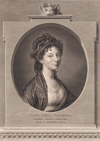 Curator: Good morning. Today we’re looking at a portrait of Anna Margrethe Buelow, made by J.F. Clemens between 1748 and 1831. It’s an engraving, with the most delicate line work, contained within an oval. Editor: She looks like she's stepped right out of a Jane Austen novel. A quiet, gentle presence, but there's something very knowing in her eyes. Almost a touch of mischief. I wonder what she was thinking. Curator: I'm struck by how intimate the portrait feels, despite the formality of the era. The pearl headband and softly draped shawl give her a certain grace, but there’s also a real softness and naturalness that comes through, due to the engraving’s intricacy, I would say. Editor: The oval frame lends a dreamlike quality. As though she is floating on the edge of consciousness. It reminds me of cameos and lockets, and whispers from the past that get carried forward through families. I bet there's some complex cultural dynamics embedded there, if one was to follow those clues back through time. Curator: You can sense that. Portraiture in the Baroque period had a purpose, and there’s that push-pull between showing a social status, but, like you said, offering this more personal glimpse, and here the balance of the social requirements with the individual spirit seems, in Clemens’s skilled hands, remarkably struck. Editor: Absolutely. And what does the visual language of portraits really tell us, besides, supposedly, preserving appearances? It’s like holding onto a fading memory, layering significance and projecting meaning through line and composition…It really sparks questions about how identities are both constructed and remembered. Curator: That's beautifully put. The artist, while adhering to a representational depiction of a particular individual, allows access to some much larger field, that vast repository of visual information and experience which, to my mind, confirms her in all our minds and memories. Editor: Exactly! The artwork becomes almost a Rorschach test. Perhaps these images act more like vessels for what we're searching for. The face we meet isn't really hers, maybe it's ultimately a version of ourselves.