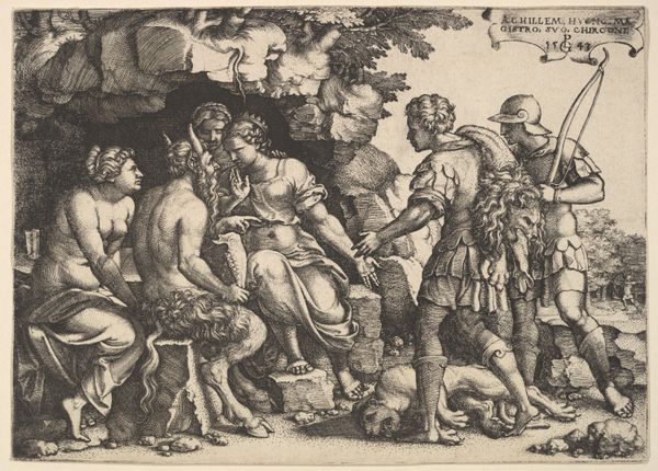 Editor: We are looking at "A drunken Silenus riding an ass being supported by satyrs", an engraving and etching by Giulio Bonasone dating from sometime between 1531 and 1576. There's so much energy and movement in this print, despite being rendered in such fine lines. What stands out to you? Curator: The most striking formal element is, without question, the dynamism achieved through the intricate and densely packed network of lines. Consider the varying weights and directions; Bonasone manipulates these to construct volume and shadow, thereby giving a powerful sense of movement to the composition. Notice the stark contrast between the frenzied activity in the foreground and the relative calm of the distant landscape. How does this compositional choice affect your reading of the artwork? Editor: It creates an immediate sense of tension! The foreground pulls me in. Does the subject add to the composition in a relevant way? Curator: Indubitably. The theme, the drunken Silenus, traditionally represents intoxication and ecstasy. He adds to this dramatic movement. How does the ass relate to Silenus in that sense? Editor: Good question! I would imagine the ass, struggling under the weight of the inebriated Silenus, is crucial to that dynamic; it symbolizes perhaps the burdens and absurdities that accompany excessive indulgence. I didn't think about that earlier. Curator: Precisely. And note how Bonasone does not shy away from the grotesqueness of the scene; instead, he meticulously renders every detail, highlighting the tension between classical ideals of beauty and the less palatable realities of human behaviour. A relevant opposition if you will. Editor: This Mannerist piece seems more complex now; the medium emphasizes chaos more clearly now than I realized. Thanks for that analysis! Curator: Indeed. The true strength of the work lies in how Bonasone transmutes this subject through line and composition into a visually arresting statement on the contradictions inherent within human nature itself.