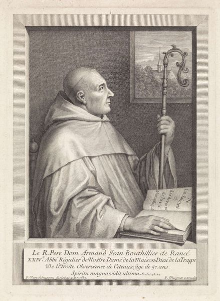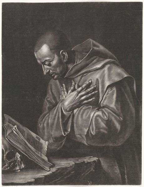 Editor: This engraving from 1688, "H. Bruno met boek en schedel," by Nicolas Bazin, is striking in its detail. The chiaroscuro creates such drama, highlighting Saint Bruno's face. I'm curious, what elements stand out to you most? Curator: What interests me most about this piece is its materiality. Engravings are a form of reproductive technology; they allow for the widespread dissemination of images. How does this engraving, through its material process, participate in the construction and circulation of St. Bruno's image and legacy? Consider the labour involved in creating this matrix for endless copies; each impression reinforces a certain narrative. Editor: That's interesting. I was focusing on the symbolic elements like the skull and the book, but the act of reproduction itself as part of the meaning is new to me. Curator: Exactly. And it prompts further questions: Who commissioned this work? What kind of paper was used, and how does its production reflect the socio-economic context? We need to look closely at the materiality to understand the work's broader impact. Notice the deliberate use of line – what does that say about control? Editor: I see your point. Thinking about the paper, the ink, the tools used, shifts my understanding from just admiring an image to thinking about its creation as a deliberate, and economically driven process. Curator: Precisely! It allows us to see this engraving not just as a portrait, but as a product of labor, a commodity with a specific function in the art market and religious discourse of its time. Considering it from a material perspective reframes it entirely. Editor: This makes me see how important it is to think about who had access to the image and what their understanding of the saint and his actions would have been, filtered through Bazin’s technique. Thanks! Curator: And thank you. Examining the production challenges that the concept of the 'artwork' as detached genius. It situates artistic expression firmly within a network of materials, labour, and social power.