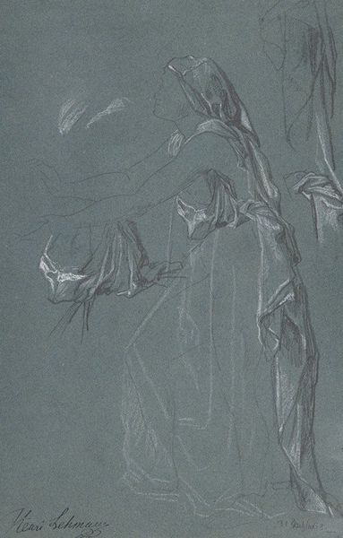 Editor: So here we have Ladislav Mednyánszky's "Nostalgia" from 1895, rendered in graphite. It has this enveloping somber atmosphere; it feels incredibly lonely. A solitary figure hunches over amidst a dark, desolate landscape. What strikes you most about it? Curator: You know, "lonely" is precisely the word that leapt into my mind, too. But loneliness can be exquisite, can't it? Look at the muted palette, like a memory fading at the edges. I wonder if that almost spectral figure represents the artist himself, wandering through the landscape of his past. Or perhaps it represents everyman. That distant, almost symbolic tree…is it an echo of something lost? What kind of a mood does it evoke for you? Editor: That's beautifully put, I like your observation about a memory fading! It makes me think of Romanticism, a sublime landscape, perhaps? It does feel kind of loaded, if that makes sense, kind of ready to burst. And this particular loneliness, you are right, may be tinged with something like quiet reflection, a self-imposed state of wandering... almost like a purgatory? Curator: Yes, exactly. Loaded, and bursting with a very quiet anguish. Mednyánszky had a fascinating, turbulent life. A nobleman who chose to paint peasants, always an outsider looking in. He was often at odds with the world and always looking for his true identity. A landscape that mirrors a restless soul... Editor: That helps frame the image more! The piece definitely takes on another layer when one has in mind the biographical context of the artist! Thanks so much for your insight! Curator: The pleasure's all mine. Hopefully this piece allows you, our visitor, to embrace a bit of that exquisite loneliness yourself. Perhaps find something beautiful in it.