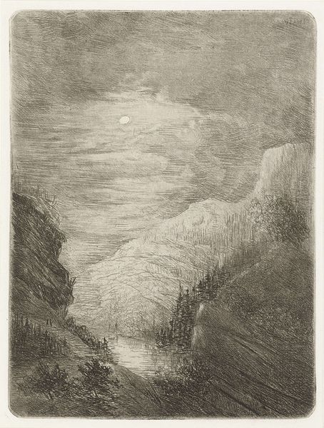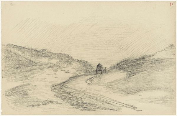 Curator: Well, first impressions: loneliness, definitely. Stark, silent. Editor: It certainly evokes that, doesn’t it? This is "Soria Moria Slott" by Theodor Kittelsen, created around 1911. He primarily used pencil and graphite. Curator: The grays and blacks are beautiful—they swallow everything! I feel like I'm standing at the edge of the world. He captures something so raw about solitude and landscape. I wonder if the choice of limited color helped emphasize such an eerie tone. Editor: Kittelsen was deeply interested in Norwegian folklore and the romantic nationalism that surged in the late 19th and early 20th centuries. The title refers to a gleaming castle, an ethereal utopia found in many Norwegian folk tales. Yet, here we see no castle, only a lone rider. Curator: Aha! That's what unsettles me. This tiny human on a vast journey—into the unknown. It feels almost...tragic. Soria Moria represents hope, and yet he pictures its pursuit like this? It’s interesting to imagine if, through the simple act of re-titling it "Solitude," how its cultural significance shifts, the perception, as well as the meaning behind the pencil strokes and shadings, alters the human reading! Editor: Precisely. By grounding this mythical quest in the somber realism of the Nordic landscape, Kittelsen speaks to the psychological weight of national identity and utopian longing. What does it truly mean to seek paradise, and what is the cost? I appreciate how you said how Kittelsen emphasizes the importance of considering its relationship with the environment, as it serves as the setting and backdrop to his symbolic storytelling through this very romanticism artwork style. Curator: Right! So, it's like Kittelsen is asking: "What is hope really, if it requires an arduous path and such solitude?" It gives me chills to ponder that! Thank you. Editor: A perfect painting to explore. Always rewarding to see how such deceptively simple drawings contain multitudes.