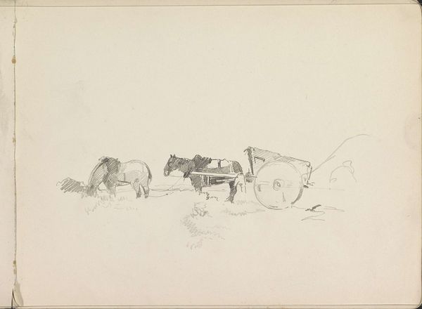 Editor: This is Friedrich Gauermann's pencil sketch, "Loaded Wagon," from the early 19th century, housed at the Harvard Art Museums. It feels transient, like a moment captured in time. What symbols or meanings do you find resonating within this simple sketch? Curator: The wagon, a vessel of both travel and burden, carries echoes of journeys, migrations, and the weight of possessions. The wagon itself is like a portable home, suggesting themes of transience and the human need for shelter and security. Do you see how the sketchiness adds to that feeling of fleeting movement? Editor: I do. The lack of firm lines emphasizes the temporary nature of the wagon's stop. It also speaks to the past, and how we carry the past with us. Curator: Exactly. It reminds us that images carry cultural memory and continuity; the wagon, in its simple form, embodies layers of history and human experience. Perhaps we all carry our own "loaded wagon" of experiences. Editor: I never thought of a wagon carrying history itself. This was insightful, thank you! Curator: A pleasure. It's remarkable how much meaning can be drawn from simple lines.