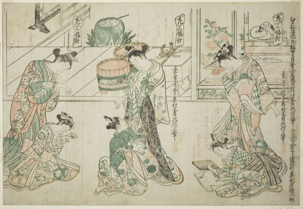 Editor: Here we have "Sanbaso Dance in a Brothel," a print by Okumura Masanobu, dating from the late 1710s or early 1720s. The monochromatic style, the focus on the figures, and the tile floor – it gives it a theatrical feel, almost like a stage. What’s your interpretation of the figures in the scene, and the way they’re positioned? Curator: It feels as though we are peering into a dream, doesn’t it? I wonder if Masanobu chuckled to himself while drawing this. See how he elevates something sacred like the Sanbaso dance – traditionally performed to pray for good harvests – and plops it down in a pleasure house! Perhaps this is a sideways glance at the rigid expectations of Edo society, wrapped in layers of wit. Do you notice the subtle details, like the faces? Editor: They're pretty expressive, especially the woman in the center with the fan. Curator: Indeed. Masanobu isn't just copying reality; he's giving us the mood of it. And the "mistakes"—are they errors or winks? Art, at its finest, isn’t about answers, but better questions. Makes you wonder if art like this could spark rebellion in an uptight society, right? Editor: I never really considered the potential subversive element of art like this before, especially back then. It's made me look at it a different way now. Curator: That's the wonderful thing about art; a fresh angle can turn the familiar into something unexpected. Remember this playful print next time someone tells you history is boring! Editor: Definitely something to ponder. Thanks for illuminating this piece!