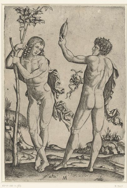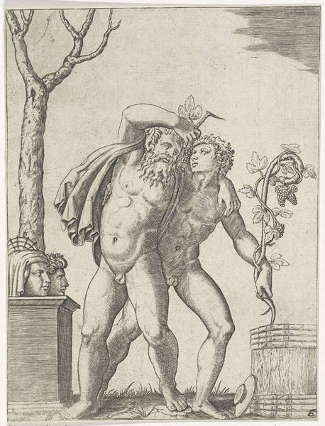 Curator: Look at the textures, so exquisitely rendered! This is Marcantonio Raimondi's "Silenus Supported by a Young Bacchus," dating back to 1520-1525, currently residing at the Rijksmuseum. What jumps out at you? Editor: The obvious thing is how loaded this feels, no? I mean drunk... but really also visually overloaded! There’s so much cross-hatching. That density and Raimondi's stark, unwavering commitment to rendering classical subjects using what looks to be an engraving process makes my palms itch to touch those labor marks on the surface. Curator: There's a tender support amidst the chaos. See how Bacchus steadies the inebriated Silenus, the mentor, the sage? Their stumble feels deeply human, a brush with frailty against the backdrop of their deity. To be honest, it feels incredibly familiar. Editor: Indeed. And yet, think of the labor! Each of those lines in the engraving meticulously placed, controlled by muscle. A barrel there beside Bacchus reminds of a place for aging wine; everything so intricately constructed—this tableau represents something much bigger than pure intoxication: resources, commodities, tools… even that wine has to come from some grapes that must come from somewhere! Curator: I wonder if there's a sliver of mischievousness in that. Raimondi presenting high society’s darlings collapsing not necessarily just as mortal, but fallible. There is definitely something there regarding classical narratives and satire... Editor: Perhaps a jab at the expense and toil, the many hours spent extracting metal from a mountain that end up serving a fleeting indulgence for elites! What this really makes me ponder, if that is the right word, is who owned it, or how it might be exchanged within wealthy European circles! Curator: So well observed, what begins as Dionysian play can't help but tumble into an understanding of real economic structures of society at the time. What seemed as playful narrative also becomes part of tangible world practices, whether he liked it or not. Editor: And vice-versa, to your point: maybe we are able to feel tenderness only as an expression made from an exploitative society! Curator: A fascinating interplay indeed – how process shapes not just perception, but also reality, then perception once more!