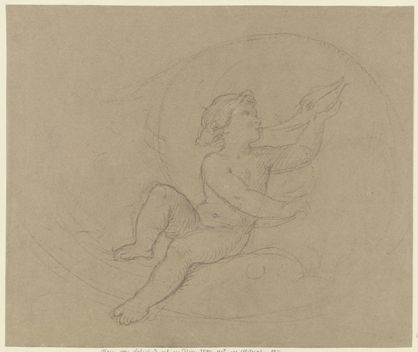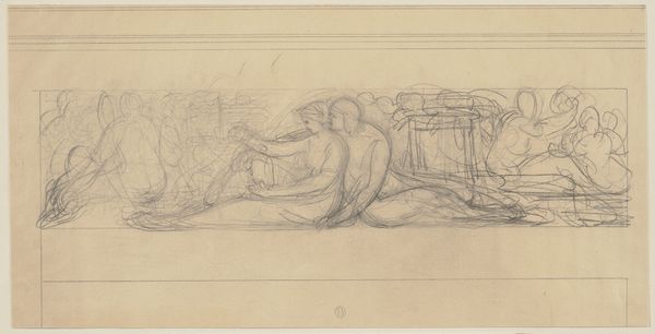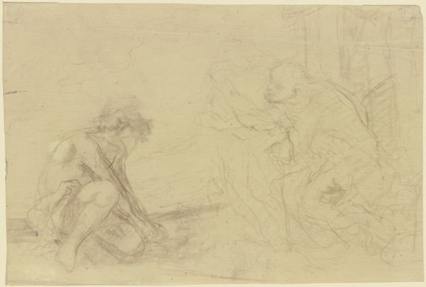 Editor: Here we have Charles Meryon's pencil drawing, "Seated Female Figure for 'San Francisco'," created around 1856. It's a preparatory sketch, quite delicate. I’m curious about the figure’s rather languid pose. What do you see in this piece, and how do you interpret her relationship to that column? Curator: I see a powerful subversion of the classical female form, which at the time, was largely used to symbolize ideals of nationhood and empire. Consider Meryon’s political leanings and staunch republicanism. The ‘San Francisco’ project, as we understand, intended to mock the rising bourgeoisie. Do you think, then, that the figure's languor might signal something else? Perhaps a critique? Editor: That’s interesting. I hadn't considered that angle. I was focusing more on the sensuality and vulnerability in her repose. Do you think her nudity in contrast to the stone pillar indicates anything specific about how femininity and masculinity are portrayed, or even challenged, within the image? Curator: Exactly! It is precisely this tension – the soft, yielding flesh against the rigid, phallic column – that destabilizes traditional gendered readings. Meryon may be employing satire to question the very foundations of power and authority represented by the classical ideal. It also compels us to consider to whom that rising Bourgeoisie was in thrall. Editor: It really makes you think about the relationship between the female body, architectural structures, and social power. I initially saw just a preparatory sketch, but now I'm considering so much more! Curator: Indeed. By placing the classical female form in tension with the modern city’s ambitions, Meryon offers a nuanced commentary on gender, power, and the ever-evolving urban landscape. We see him challenging viewers, even today, to interrogate the status quo.