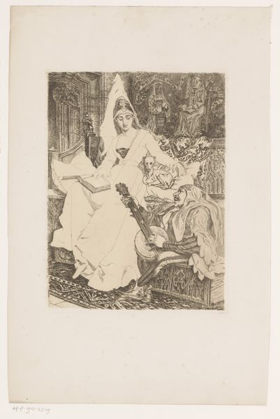 Curator: Here we have Paula Rego's "The Guardian," currently held in the Tate Collections. Editor: It's incredibly unsettling. That looming shadow, the vigilant figure... it feels like a fairytale warped into something sinister. Curator: Shadows often suggest hidden aspects of the self or repressed anxieties. The guardian figure could be seen as a symbol of both protection and control, a visual representation of inner conflict. Editor: Exactly! The child looks so vulnerable, but the "guardian" has a predatory feel about her, like a wolf in grandma's clothing. Curator: Rego often explores power dynamics within relationships, particularly those between women. Fairytales are a recurring theme, reflecting childhood fears and societal expectations. Editor: The textures and washes contribute to that unease as well. It’s definitely not the cozy bedtime story you'd expect. Curator: Indeed. Rego's work is designed to provoke, to challenge our preconceived notions. Editor: It certainly gets under your skin, in the best possible way. It is like stepping into a dream that teeters on the edge of nightmare.