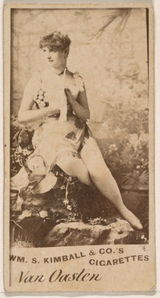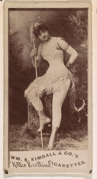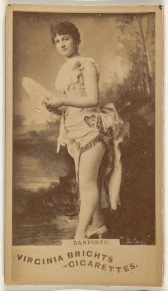 Editor: This is a portrait of Mollie Fuller from the Actresses series by William S. Kimball & Co, printed in 1889. I notice the photograph itself is sepia-toned and quite small. The figure’s garment appears almost heart-shaped. What elements of its composition strike you? Curator: The sepia tone contributes significantly to its aesthetic. Notice the gradation of tones across the print—the subtle shifts from light to dark, particularly in the backdrop. These tonal modulations create depth, a spatial recession that is immediately flattened by the abrupt crop of the photograph, causing compositional tension. Editor: Tension, yes. Can you expand on that? The composition is simple. How does it contribute meaning? Curator: The framing around Fuller, her ambiguous smile, and direct eye contact all flatten any sense of her actual space. The eye bounces between the dress embellishment and the artist information at the bottom of the shot—in turn drawing us closer to and then abruptly pulling us back from, any easy entry point or gaze. Editor: I see. The lines of the text are almost parallel to the ground on which Mollie Fuller stands, or perhaps *doesn't* stand! Thank you, it's interesting how the material of the photograph itself really becomes a core component to understanding this portrait. Curator: Exactly! This piece compels us to confront the artificiality inherent in representation and reception. There’s a calculated manipulation of depth and perspective.