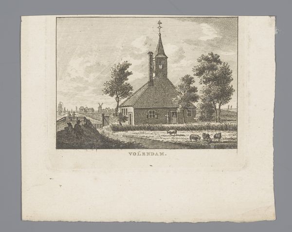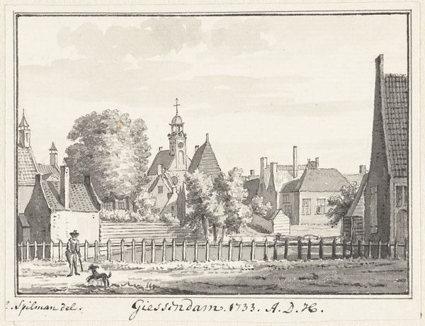 Hendrik Spilman’s delicate wash drawing captures the village of Bleskensgraaf in 1733, rendering the scene in muted grey tones. A church spire rises prominently on the left, balanced by a row of houses on the right, creating a structured, almost symmetrical composition. The drawing's structural clarity reflects Enlightenment ideals of order and reason. Spilman uses linear perspective to guide the viewer's eye, yet the softness of the washes imbues the scene with a gentle, pastoral feel. The architectural forms of the buildings and church are meticulously rendered, but the subtle gradations of tone in the sky and trees introduce a sense of atmosphere. The artist's approach to representation destabilizes a strict divide between objective observation and subjective experience. Spilman invites us to consider how the formal elements of the artwork shape our perception of place and reflect broader cultural values.