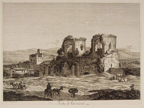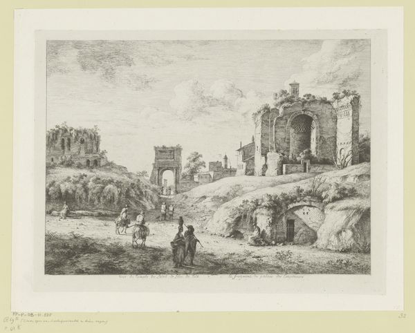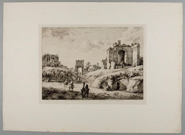 Curator: This etching by Jean Jacques de Boissieu captures the View of the Temple of the Sun, the Arch of Titus, and a Fragment of the Palace of Emperors. Editor: It's a scene of grand decay. The image gives me a feeling of inevitable decline, rendered beautifully in monochrome. Curator: Boissieu's choice to depict these ruins, particularly from the Palace of Emperors, speaks to a broader commentary on power structures and the ephemeral nature of empires. Editor: Absolutely. Note how the Arch of Titus, designed to commemorate victory, now stands weathered, a silent testament to Roman imperial ambition. It reminds us how symbols shift in meaning over time. Curator: The figures traversing the scene, seemingly unburdened by the weight of history, add another layer to the discourse. Editor: They highlight the continuity of life amid the ruins. It gives the scene a cyclical feel. I find that deeply moving. Curator: Indeed, a poignant reminder of history's echoes. Editor: A powerful reminder, beautifully rendered.
