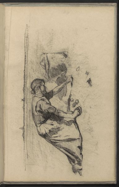 Curator: I'd like to draw your attention to "Schetsen," or "Sketches," by Johannes Tavenraat, created between 1870 and 1880. This drawing, a combination of ink and pencil, is currently held here at the Rijksmuseum. Editor: The immediacy is what strikes me. The figures are so quickly rendered, caught in moments of rest and contemplation, almost like snippets from a memory. I love how spare it is. Curator: It's fascinating how Tavenraat uses these sketches, studies of figures and landscapes, as a sort of visual shorthand. Consider the man with the hat, leaning forward – the posture itself conveys a weariness, echoed across other figures depicted in various states of repose. It resonates with archetypal figures like a traveler pausing on his long journey, or a vagabond pondering their circumstances. Editor: I'm particularly drawn to the paper itself, see those rows of numbers bleeding through? It reveals a sort of hidden labour, what seems to be perhaps accounting notes or other utilitarian scripts underscoring and embedded with the delicate sketching. The contrast creates a poignant commentary on art being interwoven into the everyday work. It challenges this concept of high art vs everyday life. Curator: Precisely! These under-drawings, seemingly unrelated, remind us that images exist in a constant dialogue with their substrate, with the supports that enable them, with their cultural setting, influencing how meaning accrues to them. The layering almost acts like a palimpsest, recording earlier narratives, imbuing them within the artistic intention of this work. Editor: Yes! The paper becomes a metaphor. Not just a surface, but a thing of labour itself! Think of the sourcing, processing, production. Someone made that paper, perhaps counting numbers themselves. Curator: I see what you're saying! What’s captured isn’t just a figure or a landscape, it’s a layered commentary on material culture and society! It serves as a wonderful example of Tavenraat's deft hand and eye, and makes us think about not only the subject matter of his drawings, but also their hidden dimensions. Editor: Definitely! After considering its story, material composition, and technique, this piece transcends just a sketchbook; it emerges as a testament to daily life.