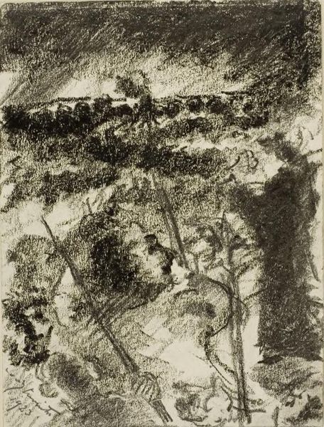 Editor: This is Lovis Corinth's "The Ark of the Covenant returns to Israel," currently residing at the Harvard Art Museums. The rough charcoal rendering creates such a visceral, almost chaotic feeling. What structural elements contribute to this overall impression? Curator: Note how Corinth's application of charcoal varies in density and direction. Observe the interplay of light and shadow; the stark contrasts generate dynamism. How does the lack of precise contours affect your interpretation? Editor: It feels like it captures a moment of intense, almost frenzied energy, like a fleeting vision. Curator: Precisely. The emphasis on the materiality of the charcoal itself is crucial; it refuses to be merely representational. Consider how that materiality shapes our understanding of the subject. Editor: I see now how the texture contributes to the feeling. Thanks for pointing that out! Curator: Indeed, reflecting on texture enhances meaning.