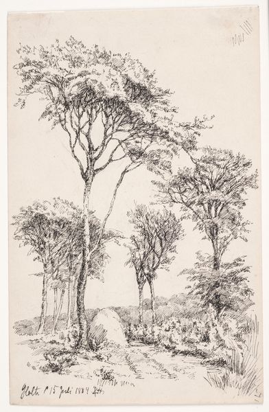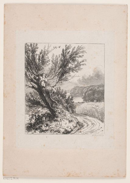 Editor: Here we have Carel Nicolaas Storm van 's-Gravesande's "Duinlandschap met kerktoren van Katwijk," a landscape etching from around 1886, currently housed at the Rijksmuseum. I'm struck by how the artist uses such delicate lines to capture such a vast, open space, and it makes me wonder about the story it wants to tell. What are your initial thoughts on this work? Curator: What truly captures my attention is how the spire in the background contrasts so sharply with the nature dominating the scene, which serves to focus the viewer's gaze into a singular area. Notice how the barren trees reach skyward. Do you think they resemble human figures supplicating some higher power represented by the church? Editor: That's an interesting point; I hadn't considered that perspective. I mainly saw them as elements that enhanced the desolate ambience of the scenery. The steeple seems diminutive when placed in relation to them. Curator: Yes, but scale isn't everything. Religious symbols persist whether you find yourself in the dunes or at sea; churches function as focal points that orient society. Also, what meaning do you extract from the individuals taking a stroll on that lane? Editor: Perhaps they represent our link to previous generations. Maybe they're pilgrims. Or are we imposing present sensibilities onto the artist’s concept by perceiving them that way? Curator: Perhaps both exist together. This kind of paradox demonstrates how symbols transform meanings across temporal settings while nevertheless reverberating from earlier periods! Editor: This dialogue is fascinating, in light of both Storm van 's-Gravesande's approach to landscape and also about this composition in general. I now have a deeper appreciation for the imagery layered into this seemingly straightforward scene. Curator: Precisely. By decoding even one picture we see more acutely how culture transmits recollections through shapes alone!