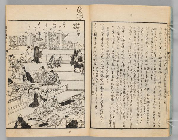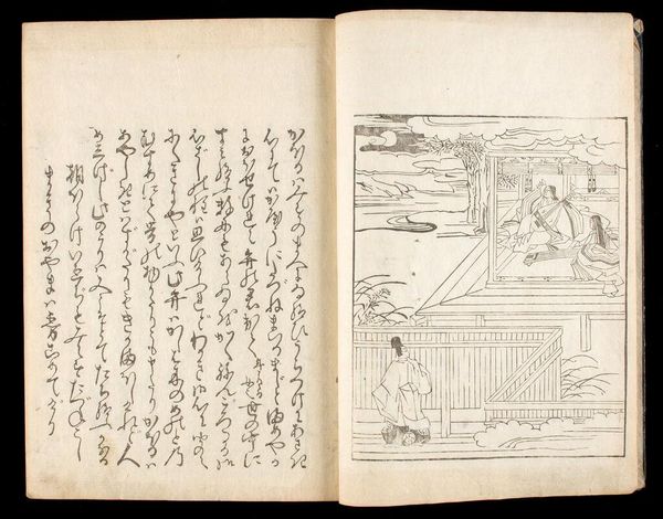 Curator: Here we have a page from Suzuki Harunobu's "The Pine of a Thousand Ages," a book printed sometime before the artist's death in 1770. Editor: It feels intimate, almost like peeking into a private world rendered in very delicate lines. Curator: Indeed. Harunobu was known for his innovative compositions and the emotional depth he brought to ukiyo-e. Notice how the figures are arranged within a confined space. Editor: The way the linear structures, like the window frames, dissect the scene creates this grid, heightening the sense of enclosure, almost architectural. Curator: And the pine itself, a symbol of longevity and constancy, whispers of timeless love and endurance in Edo society. Editor: Yes, the visual weight and placement of the pine branches adds an undeniable emotional heft to the print. Curator: It's remarkable how Harunobu used familiar symbols to evoke such nuanced feelings. Editor: A successful weaving of form and content, I'd say.