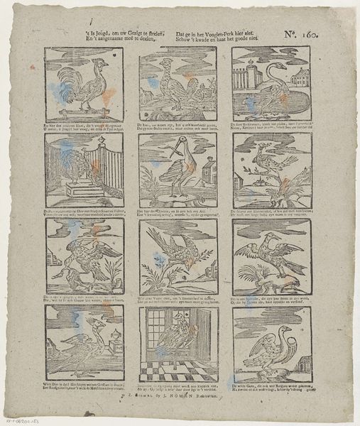 Curator: Before us we have the print, “Inhoudsopgave van de serie Honderd aspecten van de maan," from 1892 by Nagai Sogaku. It’s a work from his series “One Hundred Aspects of the Moon.” Editor: At first glance, it looks almost like a quilt. Little squares of color and text, all neat and tidy. It has an intricate order to it, but on a scale that seems intimate. Curator: The formal arrangement of the calligraphic inscriptions and the miniature landscape elements contained within each square demands our attention. Note how each unit plays with visual harmony; the deliberate placement of ink and color creates a unified whole. Editor: I am particularly struck by the process. Each miniature tableau had to be meticulously carved into the woodblocks and then printed in succession to build each square and the whole page itself. That represents countless hours of skilled labour, thinking about the relationship between design and making. Curator: Yes, and if we consider the ukiyo-e tradition within which this piece exists, the very essence lies in its graphic rendering. Each character, each brushstroke is a carefully rendered form. I can detect various techniques like bokashi shading giving certain scenes atmospheric qualities. Editor: Ukiyo-e were originally accessible objects; relatively affordable to a wide audience, not only were the scenes depicted democratized by showing people in contemporary society, the access to images also democratized art making for different classes. So to produce such an intricate print also represents something of a tension. Curator: It's that very tension, I think, that makes Sogaku’s compositions so intriguing. How he masterfully balances the popular appeal with profound formal control and depth. Editor: Exactly. It's a reflection on not only the image, but the cultural values inherent in the art production itself. Thinking of who this series was designed to appeal to enriches my experience with this print. Curator: I find that reflecting on Sogaku’s command of graphic elements—form, composition, balance—draws me closer to understanding how deeply contemplative image-making can be. Editor: And reflecting on the skilled artisans, through labouring the ink, wood and printing tools reminds me that there is both labour and inherent values in all material productions of art.