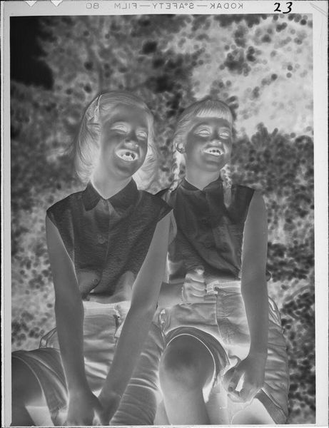 Editor: This is an intriguing vintage photograph from the Hamblin Studio, simply called "Untitled," depicting twin girls on a bench. The reversed tones give it an ethereal quality, almost dreamlike. What do you make of the connection between the twins in this image? Curator: Oh, it's a beautiful little ghost story, isn't it? The twins, mirror images holding hands… it speaks to the intense bond, the shared secrets. I wonder if their matching outfits were a conscious decision by the studio to emphasize their sameness, or a reflection of the times? What do you think it alludes to? Editor: It makes me think of childhood, but also the power of identity, both shared and individual. I see how a studio could really capture a portrait that reflects an era. Thanks for your perspective, I feel I understand this portrait more deeply. Curator: My pleasure! Art should feel like a conversation, a little dance of ideas and impressions. It's all about opening our eyes and hearts a bit wider, isn't it?