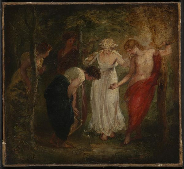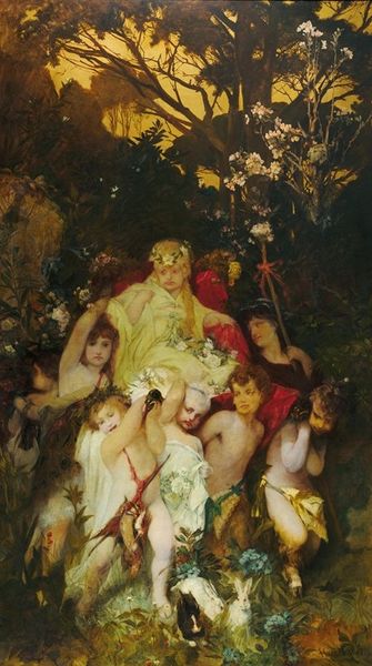 Editor: So, this is "Her Son" by Robert Anning Bell, currently at the Tate. The women seem like figures from mythology, set against a very dark background, emphasizing their ethereal quality. What do you make of this tableau? Curator: Considering the late 19th century context, these women likely represent idealized motherhood. Bell's classicizing aesthetic taps into the pre-Raphaelite fascination with myth and the role of women as paragons of virtue. The dark background does highlight their otherworldliness, but do you see a potential tension between this idealized vision and the realities of Victorian motherhood? Editor: That's interesting. I hadn't considered the social expectations placed on women at the time, only the more romanticized, aesthetic elements. Curator: Exactly. The painting invites us to reflect on how art both upholds and potentially critiques societal norms, offering a glimpse into the complexities of the period's perception of women.