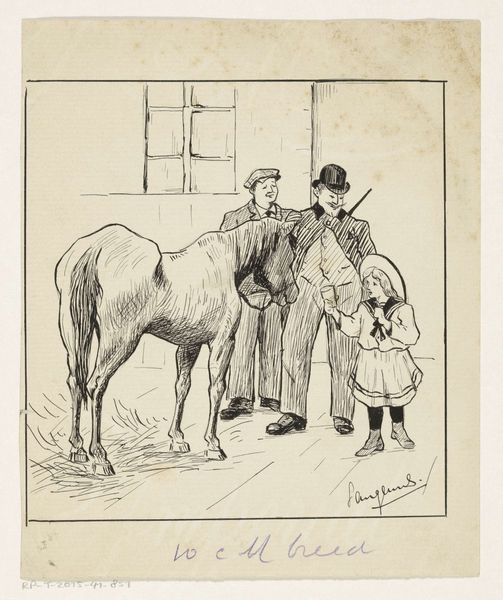 Théophile Alexandre Steinlen created this image titled "Innocence" with what looks like pen and watercolor. The composition features a gentleman, a lady, two horses and a dog which creates an engaging and somewhat charming scene. The gentle strokes of color create a serene atmosphere, drawing us into its narrative. The aesthetic structure is quite intriguing. The figures are placed asymmetrically which creates a dynamic tension. Steinlen’s delicate brushwork and restrained use of color is designed to communicate a certain mood, but also hints at deeper structural and philosophical layers. The very title "Innocence" invites reflection on the nature of purity. In closing, note how Steinlen uses scale. The large figures of the man and horses versus the smaller dog and woman is not just a representational choice, but a formal device to challenge our perceptions. Steinlen invites us to engage in a continuous dialogue with the artwork.