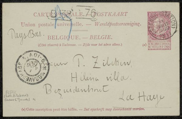 Editor: So, we have a mixed-media drawing by Rodolphe Wytsman, a postcard actually, sent before 1897. It's called "Briefkaart aan Philip Zilcken." It feels quite informal, like a quick note between colleagues. What jumps out at you? Curator: It's interesting to see this kind of ephemera preserved. It reveals a lot about artistic networks at the time. Notice the official postal markings. They place this within a specific system of communication, a burgeoning network across Europe. How do these infrastructures influence artistic exchange? Editor: That's a good point. It’s easy to forget the importance of physical mail before the internet! How might postal systems and international organizations of the period affect Wytsman's and Zilcken’s practice? Curator: Exactly! Consider the 'Union Postale Universelle' printed on the card, and how artists like Wytsman depended on such structures. The very existence of such institutions allowed for art to participate within a global economy. What art movements might they have engaged with and supported? Editor: Maybe Impressionism? Given the date and location... It also feels like artists corresponding this way highlights the social function of art, it being more than solitary genius working in a garret! Curator: Precisely. It highlights art’s deeply social existence, as opposed to being exclusively artistic labor, it emphasizes how those networks supported aesthetic innovation through personal connections but facilitated trade across markets as well. So how should this postcard, in its social setting, be received? Editor: I never considered a postcard as a document reflecting not only social interactions, but also, almost unknowingly, political policy! Thanks, that really changes how I'll look at similar works moving forward. Curator: Indeed. Seeing art as entangled with the mundane but material conditions of its making broadens our view, right? There's value in exploring this connection to history beyond aesthetics.