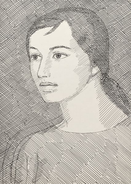 Curator: At first glance, this piece exudes a sense of quiet intensity. Editor: Indeed. This is "Female Image," a 1975 drawing by Hryhorii Havrylenko, executed in ink on paper. The portrait now resides in a private collection. Curator: The density of the cross-hatching is striking, creating a somber, almost melancholic mood. It's as if the figure is shrouded in shadow, not just literally, but also metaphorically, hinting at suppressed emotions. Do you sense that too? Editor: The meticulousness of the line work speaks to a particular artistic moment. Considering its creation in 1975, during a time when the prevailing artistic dogma in some circles still resisted overt figuration, the work stands as a subtle act of defiance. It implicitly champions individual expression within a restrictive sociopolitical climate. Curator: Absolutely. And considering the absence of context about the sitter, or even about Havrylenko’s intentions, the viewer is compelled to actively project meaning. Is she a representation of the ideal Soviet woman, conforming to the era’s expectations? Or does the intensity in her gaze, rendered with such care, hint at something more subversive? The question of who has the power to look, and who is subjected to being looked at, feels crucial. Editor: The limitations of its palette – only black ink on paper – encourages us to consider the materials available, or perhaps prioritized, at that time and place. Paper, especially, could signify relative accessibility, while ink possesses permanence, mirroring the sitter's enduring, if silent, presence. It invites a dialogue around materiality and agency. Curator: Perhaps we read into this face our own hopes for emancipation, making this female image an evocative mirror reflecting our current social awareness. Editor: And for me, thinking of the institutions that showed or ignored works such as these, helps ground her potent expression. Thanks for sharing your interpretation!