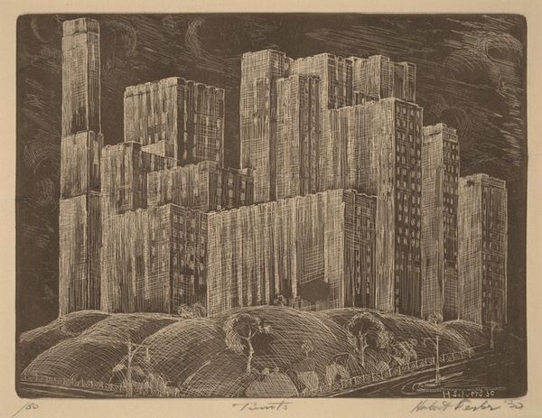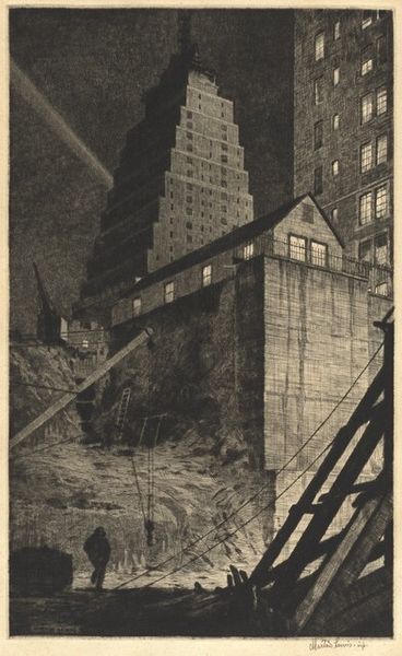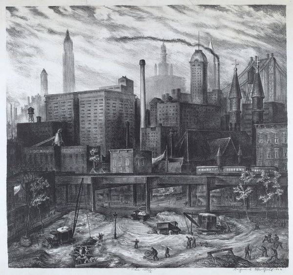 Editor: Here we have José M. Pavón’s "6th Avenue 'L' New York" from 1933, created using graphite as a print or drawing. The cityscape feels both imposing and quiet at the same time. What do you see in this piece from a formal perspective? Curator: The arrangement of light and shadow is really quite compelling. Pavón orchestrates our gaze through the dark planes of the buildings toward concentrated pockets of light—a window, a rooftop structure—and these punctuations of luminescence are strategically placed. Do you see how they guide the eye? Editor: Yes, the lights almost create a secondary structure within the darker forms. What’s the effect of rendering it in graphite, as opposed to another medium? Curator: The restricted palette intensifies the drama of the scene, reducing the city to its fundamental shapes. The absence of color encourages us to focus on the formal relationships—the balance of positive and negative space, the gradations of tone. Note too, the rounded edges of the composition, framing our view. Editor: It’s like looking through a softened lens, which isolates the subject. So the medium, combined with the limited tonal range, actually strengthens the overall composition. It moves past pure representation. Curator: Precisely. It’s about the aesthetic experience, the artist's arrangement of forms. By reducing the urban landscape to a play of light and shadow, Pavón encourages us to appreciate the intrinsic beauty of its structure. What do you make of the textural variation? Editor: The varying density of the graphite adds another layer. There’s a tangible quality, an almost palpable sense of the city’s atmosphere captured through those tonal gradations. It creates mood, more than clarity, in the rendering. Curator: It is an elegant fusion of technique and composition to evoke feeling. A close viewing reveals his intent. Editor: This really opened my eyes to how much the formal elements contribute to the emotional impact of an artwork. Thank you!