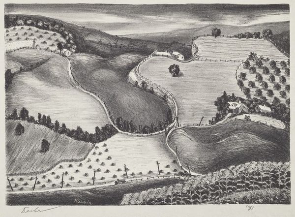 Editor: So, this is Lucy H. Doane's "Untitled (Rural Landscape with Covered Bridge)," created in 1946. It's a print, presumably made from a pencil drawing. The rendering feels very controlled, almost idyllic. The way the light streams down reminds me of religious paintings... what do you make of it? Curator: That divine light is key, isn't it? Think about how often light serves as a visual metaphor. It’s not just illumination, but also revelation, divine presence. Notice how the artist uses these distinct beams of light – they almost act as guiding forces, connecting heaven and earth within this rural landscape. Does it evoke specific cultural memories for you? Editor: I suppose it feels a bit like manifest destiny paintings, the American landscape infused with divine purpose. Is that stretching it too far? Curator: Not at all. The composition places the viewer in a position of reverence. We are witnessing something…sanctioned. This begs the question, what’s being sanctioned? A way of life, perhaps? An ideology? The symbolism resonates with broader cultural narratives. What feelings do you experience contemplating those elements? Editor: It’s comforting, but a little unsettling. Like I'm being asked to accept a particular version of reality without questioning it. Curator: Exactly. Art often asks us to confront these subtle manipulations of imagery and symbolism, even in seemingly straightforward landscapes. The 'rural' itself carries so much loaded cultural meaning, doesn’t it? What have you gleaned by taking the time to examine this drawing more closely? Editor: I’m seeing how seemingly simple landscape art can be a powerful conveyor of cultural values, using symbols that work on a subconscious level. Curator: Indeed. It's a landscape invested with layers of cultural meaning.