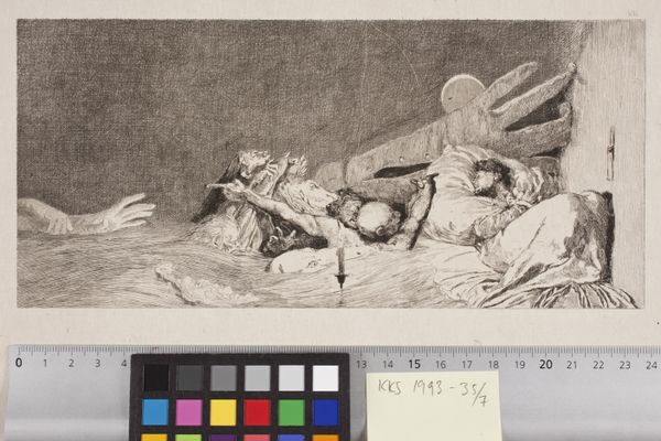 Editor: Here we have Oluf Hartmann’s "Two Women Fighting Over a Man," created around 1908. It seems to be a print, likely etching or aquatint, or maybe even a mixed media piece. The frantic energy of the figures is almost overwhelming. What do you see in this piece? Curator: Formally, the piece hinges on its stark contrast and dynamic composition. Observe the limited tonal range— predominantly blacks and grays—which serves to heighten the emotional intensity. Hartmann employs hatching and cross-hatching to build form, but the lack of precise detail obscures individual features, resulting in distorted visages expressive of raw emotion. The figures, though anatomically plausible, are rendered almost grotesque. Editor: Grotesque is a good word! It almost feels unbalanced with all that darkness, but the figures still dominate the composition. Curator: Precisely. The arrangement of the figures is crucial to its power. Notice how the figures are intertwined, creating a sense of struggle. Consider the semiotic weight of such layering. Hartmann presents an almost primordial scene of contention through form, line, and texture. Do you find this expression compelling? Editor: It is definitely dramatic. So the formal qualities create the sense of turmoil, regardless of the title? Curator: Precisely! While the title provides narrative context, it's the artistic elements themselves which deliver the artwork's essential character. Close your eyes. Think of line, composition, color, and form. They do the work! Editor: So, focusing on how the artist manipulates line and form allows us to access meaning, even beyond the literal story. Curator: Precisely. It is how the artwork speaks. Thank you. This reminds me of the need to approach any piece through the eyes of materiality and intrinsic characteristics. Editor: Definitely. Thanks, I’ve gained a deeper appreciation for how visual components contribute to an artwork’s overall meaning!