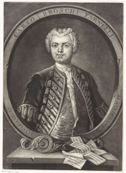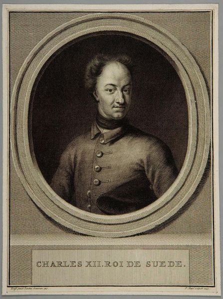 Curator: Standing before us is "Ubekendt officer af Frederik V's livregiment," or "Unknown Officer of Frederick V's Life Regiment." The artist, Andreas Thornborg, likely completed this oil painting sometime between 1745 and 1780. Editor: The monochrome palette gives it an antique feel, doesn't it? Somber, maybe even a little severe, despite the ornate frame. Curator: Yes, and the sitter's identity is as much a material absence as the muted colours. Portraits like these, often commissioned by or for the officer class, solidified power structures in Danish society, particularly concerning the monarchy. It brings up questions about how gender and class intersect within military and social hierarchies. Editor: Power is definitely the key here. It’s right there in the meticulous detail on the uniform—the weave of the fabric, the cut of the coat. Look at the time and labour it took to produce this image; consider the social capital involved. Who was making the fabric, painting this, and for whose consumption? The material signifies wealth, position. Curator: Exactly. Thornborg positions his subject deliberately. While we can't say with certainty who this man was, his dress, pose, and accoutrements point to someone of notable status. But absence of name provokes thought about erasure from history, or anonymity, a collective experience maybe in face of absolute rule. Editor: I keep returning to the frame. It looks like worked silver. Frames in that era weren’t just decoration; they elevated the status of the painting, and the sitter. They’re both structural and symbolic; trapping this "unknown officer," if you will. Curator: Yes! The choice of monochrome seems less about style and more about reproduction. Did this artwork exist also as a copperplate engraving that circulated in Copenhagen? The portrait’s distribution through prints could affect readings across lines of gender, race and class. Editor: To think of it being copied and printed…That pushes me back to considering its initial creation: the labour, and cost behind the paints, the brushes, the canvas. It forces us to examine art not just as an image, but as an object embedded in a network of production and consumption. Curator: Absolutely. Reflecting on how Thornborg's historical portrayal echoes or challenges contemporary discussions on gender, identity, and visibility allows us to critically examine the narratives of power then, and how those play out even today. Editor: Looking closely at its construction helps peel back the layers of its creation and connect to tangible lives of those making, viewing and owning at the time, as well as asking whose labour this man's uniform was built upon.