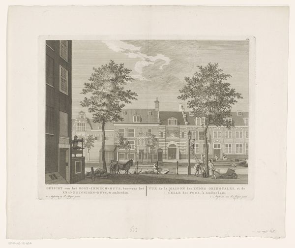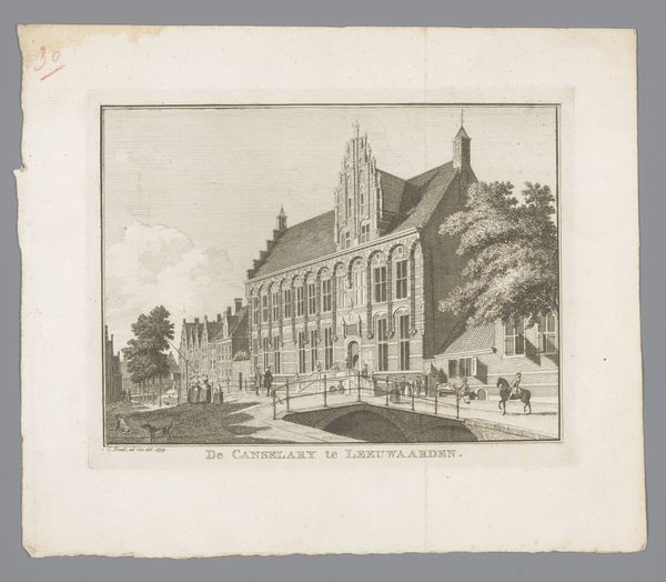 Curator: This print, residing here at the Rijksmuseum, is entitled "Gezicht op de Doopsgezinde Singelkerk gezien vanaf de Herengracht te Amsterdam," created around 1726 by an anonymous artist. It's rendered through etching and engraving techniques. Editor: My immediate sense is one of austere grandeur. The imposing façade of the church and the clean lines establish a harmonious, yet almost severe visual order. Curator: Indeed. What stands out is the evident attention to detail in rendering the architectural elements. You see a fascinating interplay between the printmaking medium, here specifically etching and engraving, and the representation of a powerful, new church in Amsterdam. This work encapsulates the values of Dutch Golden Age society: a meticulous capturing of spatial relationships, a celebration of progress. Editor: I’m struck by the way the artist uses line to define form. The regularity of the fenestration creates a rhythm, only broken at the top by the artist where the facade follows classical rules for roof decoration. I suppose it can be said it speaks to more than just an aesthetic preference. I believe the evenness represents the very order the Mennonites sought. Curator: Exactly! The choice of the church's location on the Herengracht also reflects a specific social context: the ambition and wealth of its community as Amsterdam becomes a global trading hub. It's hard to say who made this print exactly. Was it someone from within the Mennonite community keen to establish a presence or impress, or someone wanting to document these shifting forces in Dutch life? Editor: Good question! It would be valuable to identify more of the human aspects. We can deduce so much simply from how its structural components speak both to utility and religious principles. How many artisans might have contributed skill and materials here? Or how much does this church, from the perspective of scale, color, shape, and symmetry contribute to a sense of peace for the artist? Curator: Viewing this work with your emphasis allows one to really understand what goes into building Amsterdam - the faith and commerce embodied within those decisions. It's far more layered than just a scenic view of a church. Editor: Ultimately, looking at the print shows one more layer that this image adds to Dutch society at the time: faith, politics and craftsmanship together tell a history.