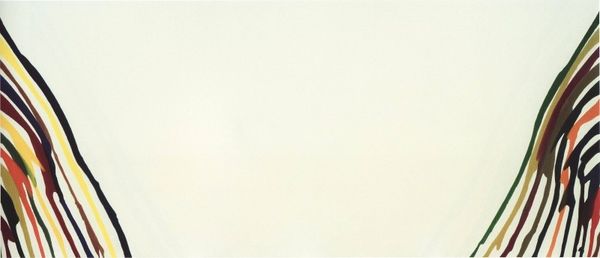 Editor: Today we're looking at Morris Louis's "Gamma Ro," created in 1960 using acrylic paint staining on canvas. I’m immediately struck by how much the off-white canvas seems to dominate the composition despite the powerful stripes of color. How do you interpret this piece? Curator: It’s fascinating, isn’t it? For me, the ‘stain’ becomes incredibly significant. It transcends mere technique; it’s an act of almost…embedding color into the very being of the canvas. The unpainted canvas, therefore, is not negative space but an active, breathing element. These colorful stripes seem like echoes, almost spectral in their presence, like cultural memory struggling to surface. What feelings do those particular colours invoke in you? Editor: Well, the blues and greens remind me of nature, but the black throws me off a bit – it feels almost ominous next to the other colors. Is it just me? Curator: Not at all! The black could be interpreted as a shadow, a reminder of the weight of history that informs even the most joyful colors. Or consider this: these colors bleed into the canvas – they’re permanently altering it. How does this transformative act resonate within the context of its time? Editor: So, are you suggesting it could be a symbolic representation of societal shifts? Maybe how culture gets absorbed and reinterpreted? Curator: Precisely! And consider how abstract forms invite multiple interpretations, functioning like cultural Rorschach blots reflecting back our own values and experiences. Editor: That's a very interesting idea... It completely shifts how I view abstract art. Thank you for pointing this out! Curator: My pleasure! Hopefully you’ll never look at “empty space” the same way again.