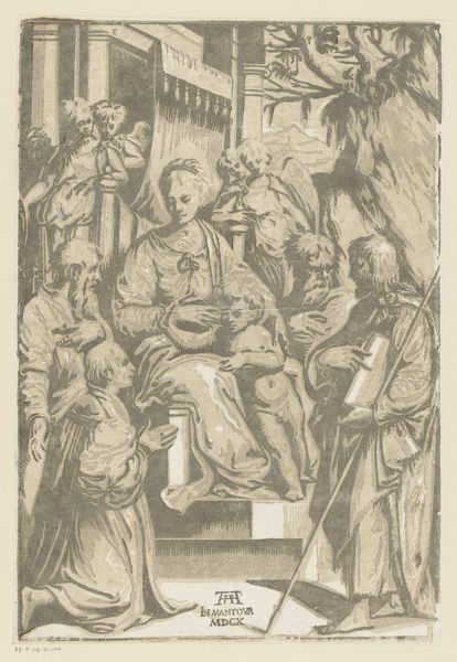 Curator: Looking at this Italian Renaissance print from somewhere between 1507 and 1599, attributed to Alessandro Gandini, titled "Maria met kind omringd door heiligen," my immediate impression is of a powerful convergence, a bringing-together of distinct energies. Editor: Indeed, there is a sense of condensation here, visually compacted by the high contrast and limited tonal range typical of pen-and-ink sketches. Note how Gandini constructs form primarily through outlines and hatching, which gives it this rather dramatic feel. The dense linework in areas like the foliage further intensifies this sense of visual concentration. Curator: Yes, that’s accurate. Beyond its compositional rigor, the artwork's narrative is deeply embedded in religious symbolism. Mary, with the child Jesus, is clearly central, evoking millennia of artistic tradition representing divine motherhood and innocence. But it’s the gathering of saints, their expressions, that really intrigues me. What do you make of them? Editor: From a formal perspective, it’s all about how the artist groups and poses the figures to direct the eye. Look at the rhythmic repetition of heads clustered around Mary, all slightly tilted, creating a visual echo chamber, almost. The strong verticals of the architectural elements and the figures help organize the space. Curator: I'd argue that the figures act as emotional conduits. Each one, from the kneeling boy to the haloed figures peering from the background, reflects a different facet of devotion. I find the work’s potency arises not just from aesthetic choices but from its ability to condense centuries of faith into a single, digestible image. Editor: Well, I can agree there. Ultimately, though, for me it's a matter of evaluating how these visual choices generate an overall aesthetic experience that is unique to printmaking. Curator: It certainly provides rich insights.
