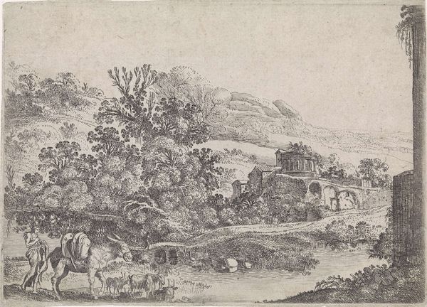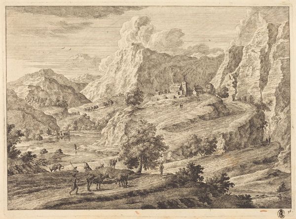 Curator: What a delicate rendering. Christian Wilhelm Ernst Dietrich, who worked primarily as a painter, made this print, titled "Arcadisch berglandschap," sometime between 1722 and 1774. It’s an etching on paper, and currently part of the Rijksmuseum collection. Editor: Ah, my first impression is almost of looking into a hazy dream. The soft lines, that towering peak in the distance, it feels both serene and slightly ominous. Does that resonate with the Arcadian theme, you think? That sense of idyllic beauty tinged with a lurking something? Curator: It does. The idealized Arcadian landscape tradition, popular during that period, often served as a space to explore complex social and philosophical themes under the guise of pastoral imagery. Think of the politics embedded in envisioning an escape from the contemporary world. Editor: So, not just pretty pictures, then? I suppose those figures in the foreground aren’t just lounging around; there’s a narrative woven in there somewhere? It feels so performative almost a staged scene of leisure. Curator: Exactly. Consider the cultural context of printmaking in the 18th century. Prints like this were easily reproduced and widely distributed, allowing these Arcadian visions and their embedded ideologies to reach a broad audience. Think of it as early social media for the elite. Editor: So, Dietrich isn't just depicting a pretty scene; he's also participating in this visual discourse? It’s amazing to think something that looks so, dare I say, "old engraving style," could actually have had such a potent social function. But beyond all that, there’s still something beautiful, and accessible about it. Curator: Precisely! Its accessibility is by design, to be sure, ensuring its message, subtle or not, resonated broadly. But it's also true to credit Dietrich for creating something really lovely. It makes me appreciate its historical weight even more. Editor: It’s changed my perspective already. Next time I need to think about impact versus image, I'll remember that misty mountaintop and those loungers hiding a history lesson!