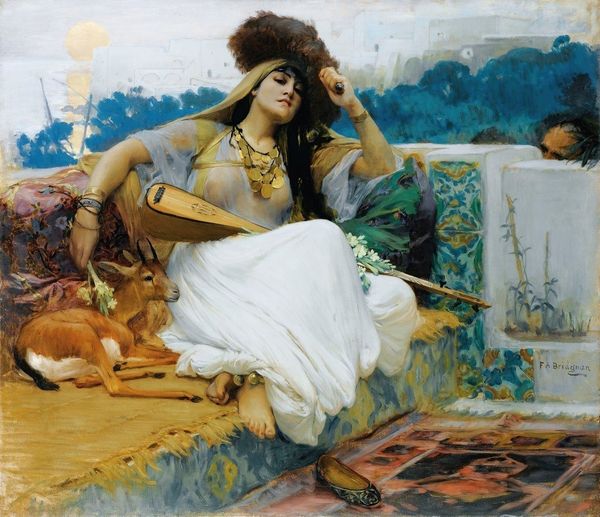 Henryk Siemiradzki painted 'Southern Beauty', in oil on canvas. The woman's thoughtful gaze draws us into this scene, yet it is the interplay of color and light that truly defines the painting. The golden yellow of the woman's garments dominate the composition, a hue that is echoed in the highlights of the marble sculpture and the warm tones of the stone architecture. Note the contrasting cool blues and greens in the distant landscape which create depth, yet the limited palette maintains a sense of harmony. Siemiradzki's brushstrokes, though subtle, are crucial in conveying texture. The soft, diffused light enhances the scene's idyllic mood. The painting doesn't just represent a woman; it orchestrates a dialogue between color, light, and form. This piece is a study in how visual elements can evoke a particular atmosphere and aesthetic experience.