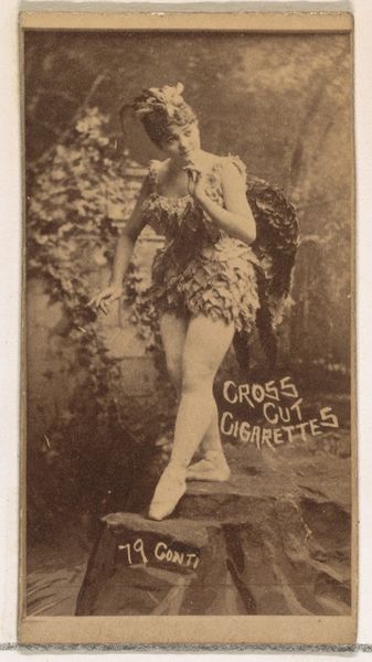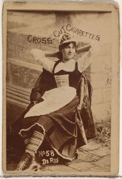 Editor: This is card number 231, Hall, from the Actors and Actresses series, created by W. Duke, Sons & Co. in the 1880s. It's a promotional print for Cross Cut Cigarettes, depicting a woman in what looks like a theatrical costume. The photograph has this old-fashioned, slightly faded quality... It feels quite staged, almost voyeuristic. What's your take on it? Curator: I see it as a potent snapshot of the late 19th century's complex relationship with women, performance, and the burgeoning advertising industry. The woman, posed and objectified, becomes a commodity herself, used to sell another commodity – cigarettes. Think about the social constraints placed on women at this time. How does her semi-revealing attire challenge or reinforce those societal norms? Editor: I guess it's both? It's provocative for the time, yet she's also framed within this very controlled, almost doll-like pose. Curator: Exactly! It’s about the male gaze and how that gaze dictates the representation of women. This card is one tiny piece of a larger cultural phenomenon. These cards were often collected and traded, making this image, this woman, incredibly accessible, almost disposable. Where do you see power dynamics at play here? Editor: Well, the company clearly has power, using her image for profit. And the assumed male consumer is given power to possess and objectify her through the image. Curator: Precisely. And understanding that power structure is key to critically examining these seemingly innocent relics of the past. Editor: That makes me see the print in a totally different light. It's not just a pretty picture; it's a cultural artifact loaded with meaning about gender and consumerism. Curator: And that’s why it’s so important to analyze art within its social and historical context. Editor: Absolutely. I'll definitely look at these kinds of images differently now.