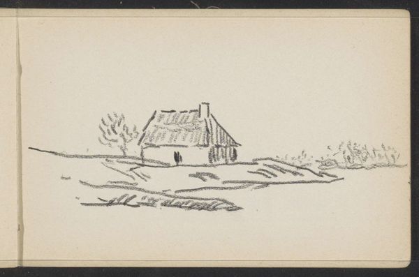 Curator: Look at this intriguing sketch from 1895! Willem Cornelis Rip captured “Huis te Zaandam” using pencil and ink on toned paper. What's your immediate take on this unassuming little piece? Editor: Well, I am immediately struck by how fleeting it feels. The roughness and immediacy convey an aura of quiet transience—the scene feels very intimate. Almost melancholic. Curator: Intimate is a perfect descriptor. Knowing this was likely torn directly from Rip's sketchbook emphasizes that feeling of privileged access, doesn't it? We’re glimpsing a moment in time. Notice the precision in the architectural details contrasting with the softer rendering of the surroundings. It gives me the feeling of… Editor: ...a personal observation. Almost a reverie captured on the page, with the artist lost in his world of thought. The house almost appears like a symbol, perhaps standing in for larger themes such as memory, solitude, and reflection. Curator: Yes, definitely solitude! This piece almost anticipates the more psychologically charged landscapes of early Modernism. While adhering to realist principles, there's still an intensely personal filter. The sketch is incomplete, revealing much of the toned paper and lending a quiet tone to it. Do you feel the loose sketch hints at narrative elements? Editor: Oh, absolutely. The almost diagrammatic depiction feels potent, loaded with subtle semiotic information. Perhaps for Rip, Zaandam wasn't merely a place but a mental state. I feel like a code-breaker puzzling out a dream… It allows my imagination to travel into it… Curator: It really speaks to the power of art to capture feeling beyond strict representation. Even an unfinished sketch from a sketchbook can offer such a rich aesthetic and emotional experience. Editor: Precisely. It highlights how images speak to a certain psychological weight. This quick drawing is less about the structure itself and more about the lingering emotional charge it held for Rip. It invites each of us to contemplate what home, or rather huis, truly means.