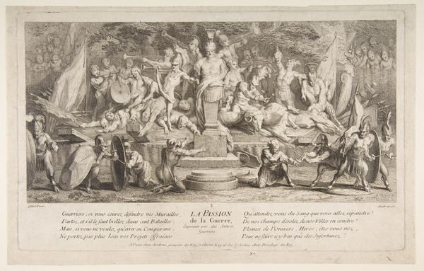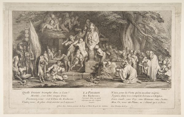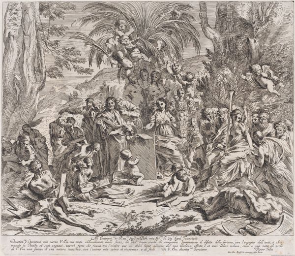 Claude Gillot created "The Fête of Bacchus" with etching techniques, a print now held at the Metropolitan Museum of Art. Initially, the composition presents a scene of bacchanalian revelry. The figures are densely packed, creating a sense of chaotic movement across the plane. Note how Gillot employs line and texture to differentiate forms. Through this, an exploration of classical themes emerges as a celebration of uninhibited joy, underscoring a dialogue between order and disorder, restraint and release. The symmetry of the landscape is broken by the wild abandon of its occupants. This hints at the underlying structures and cultural codes within which the artwork was both created and interpreted. Gillot’s work invites a re-evaluation of accepted norms through its raw energy and freedom, allowing for a continuous process of interpretation and meaning-making.
