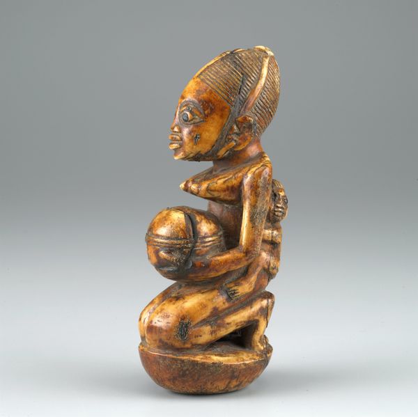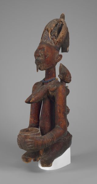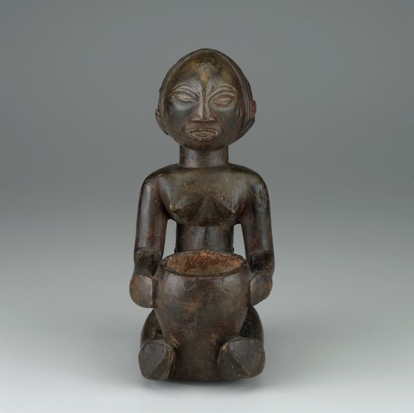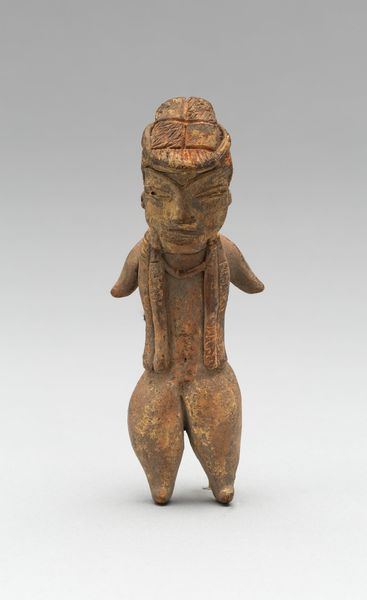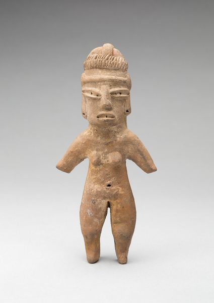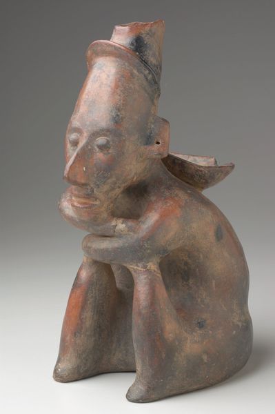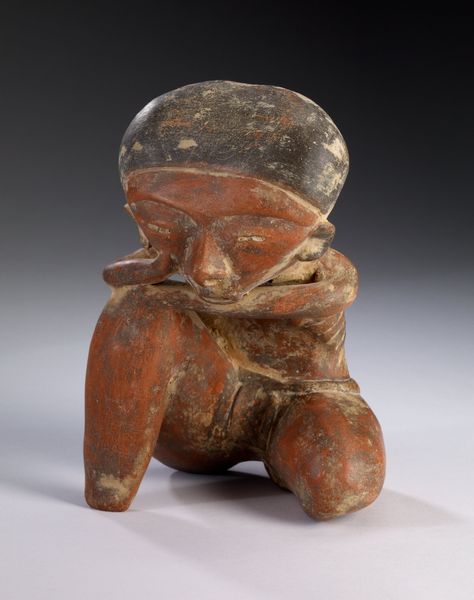 Editor: This terracotta sculpture, "Seated Hunchbacked Dwarf," dates from around 300-400, and was created by the Colima people. The figure strikes me as oddly powerful despite his physical limitations, almost like a warrior in repose. What do you see in this piece, particularly in how the figure is represented? Curator: The power you sense is key. Consider how often disability has been either erased or stigmatized in visual culture. This Colima sculpture disrupts that. The hunched back and the seated posture are presented not as weakness but as integral aspects of this individual's identity, and perhaps even his spiritual potency. Do you notice anything particular about the facial expression or body language? Editor: He seems very alert, with his mouth slightly open as if he’s speaking or listening intently. His muscular arms and focused gaze convey strength, defying typical stereotypes of someone with a hunched back. Is that intentional subversion? Curator: "Subversion" might be too strong a word, but it certainly challenges preconceived notions. Pre-Columbian art often incorporated individuals with physical differences not as pitiable figures, but as respected members of society, sometimes even believed to possess unique spiritual insights. Look at the ceramic medium itself. Why ceramic, and why rendered so realistically? Editor: Perhaps the choice of clay emphasized the figure's connection to the earth, suggesting grounding and resilience. The lifelike representation would create an empathetic relationship between the viewer and the subject, wouldn’t it? Curator: Precisely. The Colima artists weren't simply depicting a physical form, they were encapsulating the enduring spirit and humanity within that form, reminding us of the value and strength present in every individual, regardless of physical appearance. It invites contemplation on what constitutes “normal” and challenges our preconceived notions about ability and representation. Editor: I see him differently now, not just a figure but a powerful symbol of acceptance and resilience, embodied in clay. Curator: And a cultural touchstone connecting us to an ancient civilization's values.