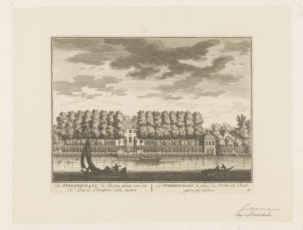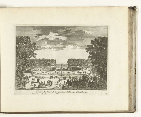 This detailed garden scene was created by an anonymous artist through the process of etching. The composition is achieved by carefully incising lines into a metal plate, which would then be inked and printed onto paper. Consider the level of skill required to capture such detail – the crisp lines defining the architecture, the feathery textures of the trees, and the delicate shading of the clouds. The work involved in making this print speaks to a culture that valued precision and patience. The image itself is interesting, depicting a garden. Notice the symmetry and order. These are manicured grounds. The social significance of this artwork lies in its ability to showcase the leisure and affluence of the privileged class. This etching invites us to consider the labor and resources required to maintain such an environment, and the social inequalities it represents. It challenges us to look beyond the surface, and to recognize the stories embedded within the materials and processes of its creation.