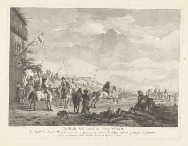 Curator: Look at this fascinating engraving, “Figuren in een drukke haven met een brug op de achtergrond,” or “Figures in a Busy Harbor with a Bridge in the Background,” by Quentin Pierre Chedel. Dating back to sometime between 1755 and 1763. Editor: It’s amazing, almost bustling, even though the colour palette is so subdued. It feels like a faded memory, a glimpse into a world that once was, yet still echoes with the murmur of daily life. There’s something undeniably romantic about it. Curator: Definitely. See how he’s captured the essence of a port city. There are people loading goods, some on horseback, a little boat crowded with passengers and what looks like ruins on the edge of the water. The bridge seems to signify the connections, physical and societal, that tie this all together. It’s a narrative landscape, isn’t it? Editor: It is! I’m particularly drawn to how Chedel depicts movement. The horses straining, the figures huddled in conversation – each carries a story. It’s a little like peeking into individual lives, yet also observing the grand flow of commerce and human activity. Curator: Precisely. It’s quite Baroque, isn’t it, in its dramatic use of perspective and light, despite the medium being so different from paint. All of these small marks communicate something large. You mentioned its “romantic” quality – I think that speaks to a wider interest in landscapes and the lives of ordinary folk that grew in popularity in that time. It moves away from strictly formal portraiture or grand historical scenes. Editor: I see it as a reflection of a society in flux, you know? The burgeoning merchant class and the continued presence of, well, beasts of burden, cheek to jowl together in this busy harbour. The etching perfectly capturing a sense of tension, perhaps, between progress and tradition. Curator: Exactly. The “old engraving style,” as our metadata says, brings a sense of historical weight, but it also gives a certain ethereal quality. Editor: In a way, it allows the past to speak directly to the present. Looking at it I can hear echoes of their lives. Curator: Absolutely. This unassuming little engraving has a lot to tell us about who we were.