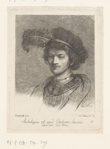 Editor: This is "Edelknaap," an etching and engraving by Jacques Doré, created between 1882 and 1888. The fine lines really give it a detailed look, almost like a study of texture and light. I’m curious about what details stand out to you? Curator: What strikes me immediately is the treatment of light and shadow through line work. Note the density and direction of hatching used to create volume. The formal device guides our eye, delineating the contours of the face and the folds of the clothing. Editor: The clothing *is* quite something! All the ruffles… what’s the point of including that level of sartorial detail? Curator: Observe how Doré juxtaposes areas of high contrast, for instance in the rendering of the cap versus the more diffused handling of the background. These juxtapositions create a visual rhythm. What do you observe? Editor: Now that you mention it, it seems like he used the contrast to make certain areas pop—the face especially. Is the backdrop meant to be just a backdrop, or part of the story? Curator: I believe that background is, in a semiotic sense, functioning as a signifier of depth rather than of any specific narrative space. Doré wants the viewer to appreciate how line alone can describe a material world. It is all about how texture and light interrelate, nothing more. Editor: So it’s about the method, more than the meaning. Interesting. I’ll definitely be looking at etchings differently now, paying closer attention to the use of line and shadow. Curator: Precisely. Seeing the visual architecture can sometimes be more revealing than understanding narrative.